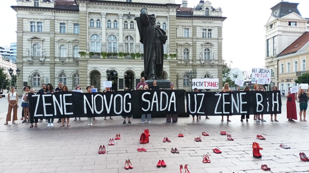 Na Trgu Slobode, ispred Gradske kuće, postavljena su 24 para ženske obuće, kao podsećanje na 24 femicida u Srbiji ove godine, kao i veliki transparent sa porukom „Žene Novog Sada uz žene BiH“.