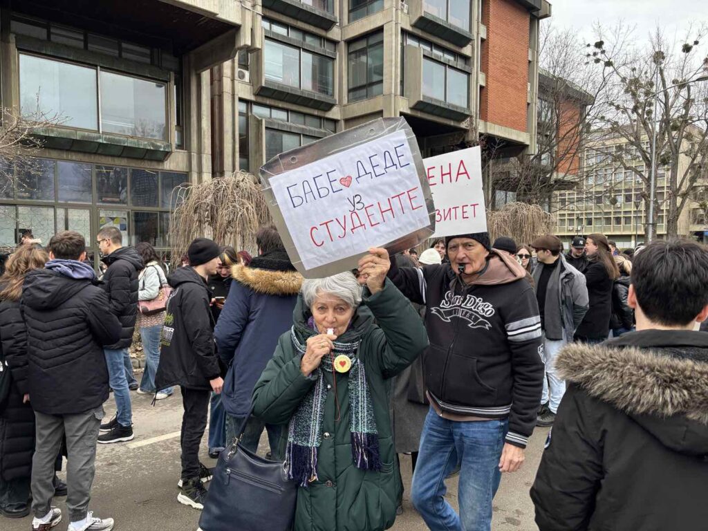 Okupljeni nose transparente na kojima piše „Babe i dede uz studente„, „Neodustajanje„…