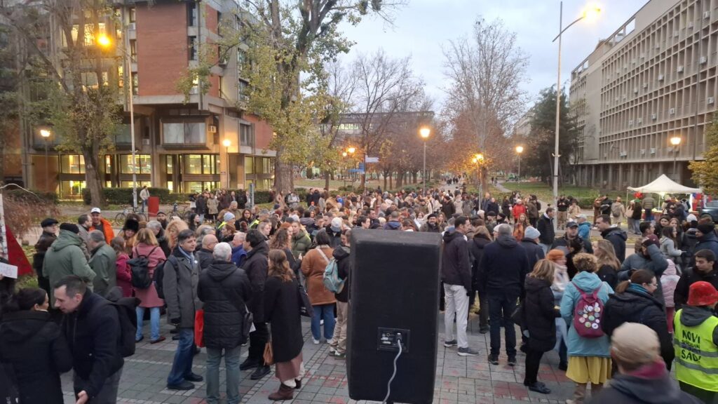 Na skup je pozvala Akademska mreža Slobodan univerzitet, čije se zastave vijore ispred Rektorata, uz muziku sa razglasa.