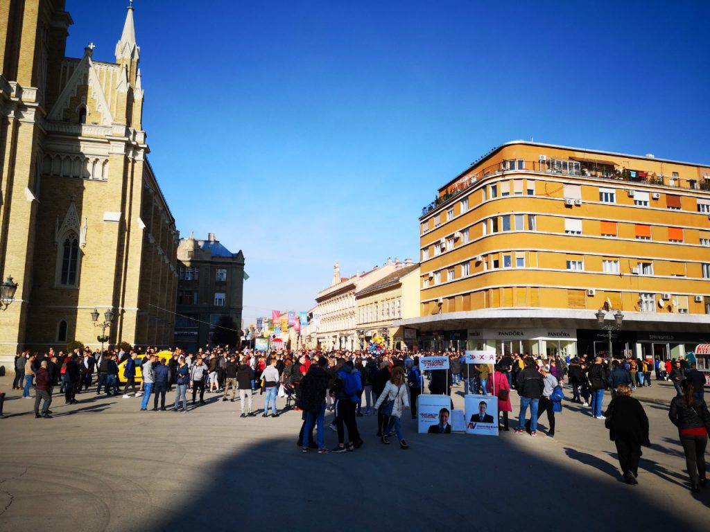 Tu akciju oni su juče najavili, a sat vremena pre njihovog dolaska na Trgu slobode, na kojem se nalazi i Gradska kuća, postavljeno je tridesetak stranačkih štandova Srpske napredne stranke, sa fotografijama lidera te partije Aleksandra Vučića.