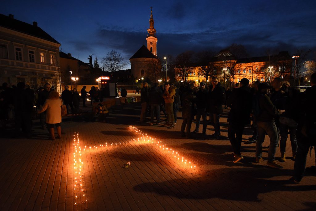 Okupljeni građani su na Trgu republike u tišini palili sveće i postavljali ih na tlo tako da formiraju latinično slovo „H“, dok su svojim telima napravili krug i na taj način simbolično prikazali heliodrom na koji major Omer Mehić, njegove kolege i putnici te kobne noći nisu uspeli da slete.
