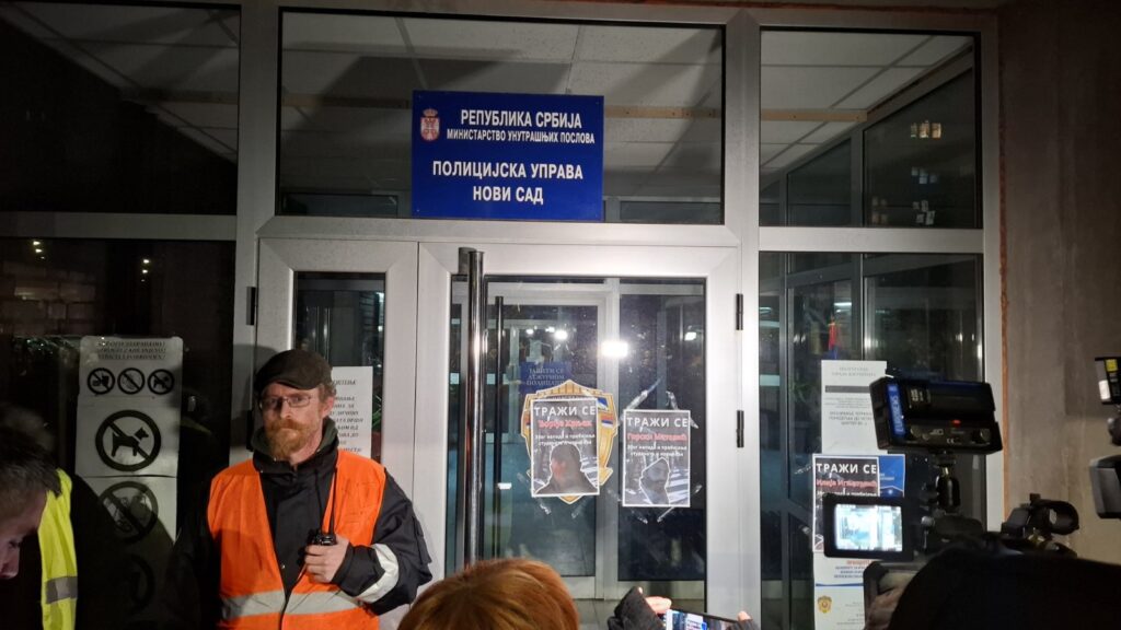 Demonstranti su na vratima policijske zgrade zalepili „poternicu“ za režimskim batinašima koji su snimljen na sinoćenjem protestu kako fizički nasrću na studente i novinare.