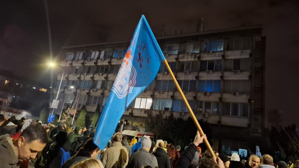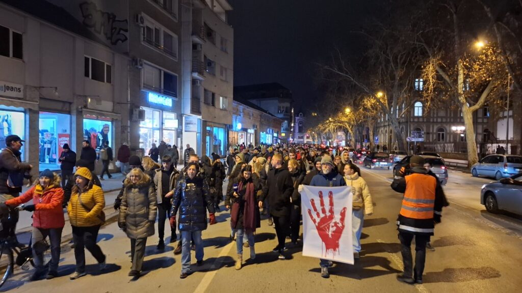Oni su nosili transparent sa krvavom šakom, kao i kravavu zastavu Novog Sada.