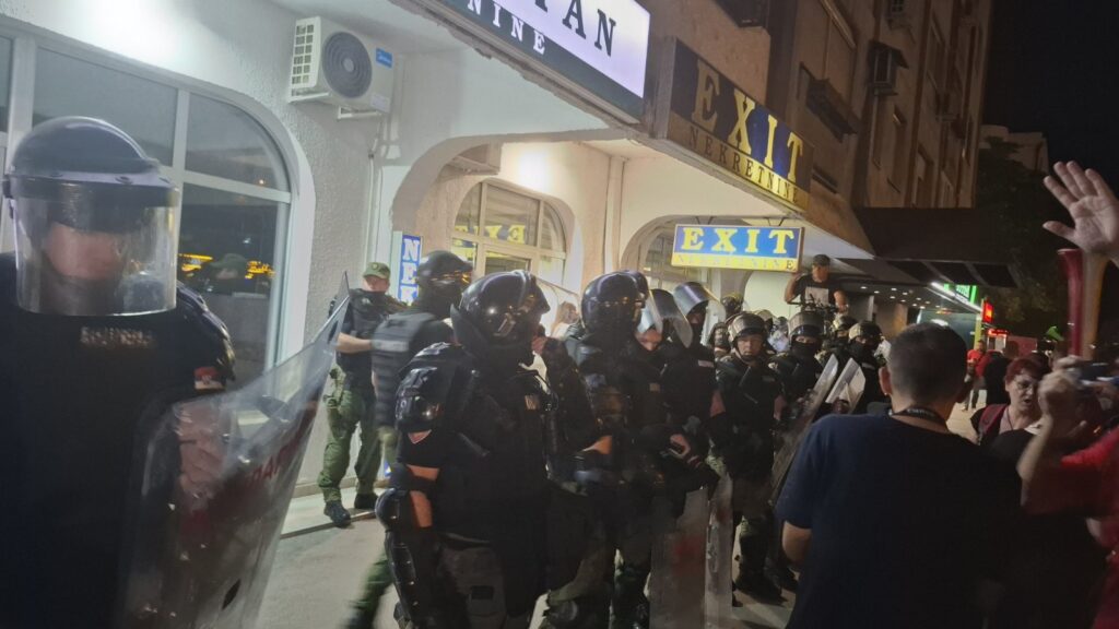 Okupljeni demonstranti su skakali i vikali „Izlazite napolje“ i „Ko ne skače, taj je Ćaci“.