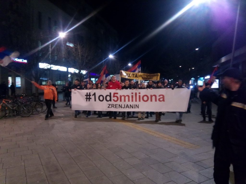 Četvrta protesna šetnja 1 od 5 miliona održana je večeras u Zrenjaninu, više stotina građana okupilo se u centru grada, a zatim su šetnju nastavili kraj Gradske kuće do najvećeg gradskog naselja Bagljaš.