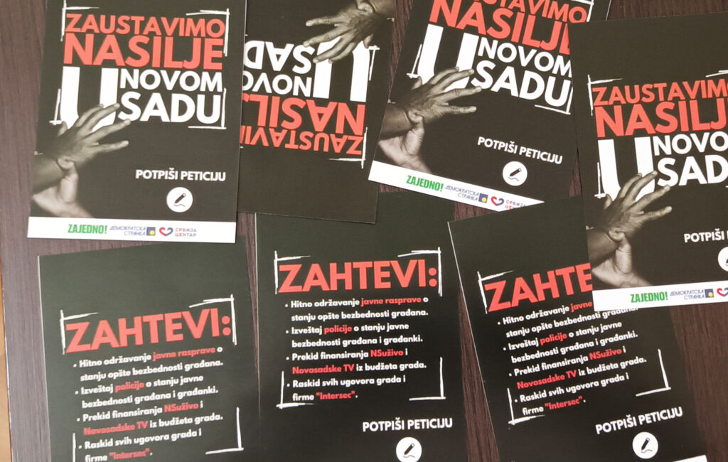 Novosadski odbori Demokratske stranke, Zajedno! i Srbija centar „Srce“ večeras u 19 časova ispred Katoličke porte počinju prikupljanje potpisa za peticiju u okviru inicijative „Zaustavimo nasilje u Novom Sadu“.