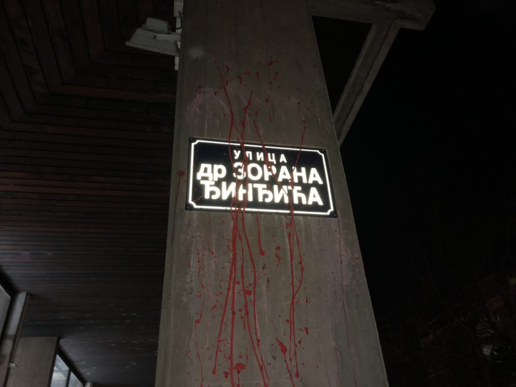 Po tabli sa nazivom Ulica Dr Zorana Đinđića na Filozofskom fakultetu u Novom Sadu danas je prosuta crvena farba.