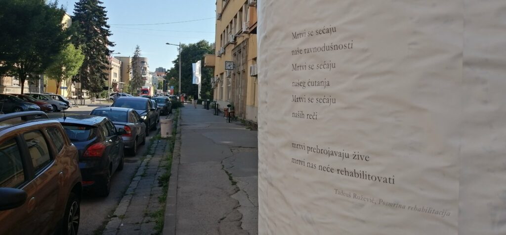 Na plakatima se nalaze stihovi „Posmrtne rehabilitacije“ poljskog pesnika Tadeuša Ruževiča: „Mrtvi se sećaju naše ravnodušnosti/ Mrtvi se sećaju našeg ćutanja/ Mrtvi se sećaju naših reči/ Mrtvi prebrojavaju žive/ Mrtvi nas neće rehabilitovati“.