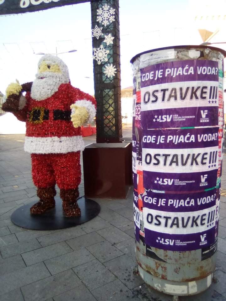 „Gde je pijaća voda? Ostavke!!!“, piše na ljubičasto-belim plakatima, koji su potpisani sa LSV i Vojvođanski front.