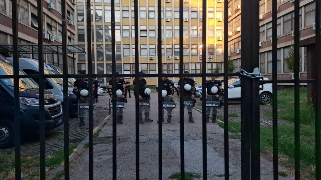 Tokom današnje blokade prisutne su bile jake policijske snage, u nekim momentima i brojnije od građana, a blokirani su bili svi ulazi u ovu zgradu – glavni iz Sutjeske ulice, kao i više sporednih iz Radničke ulice i iz Ulice Maksima Gorkog.