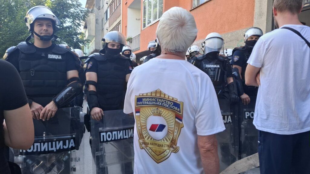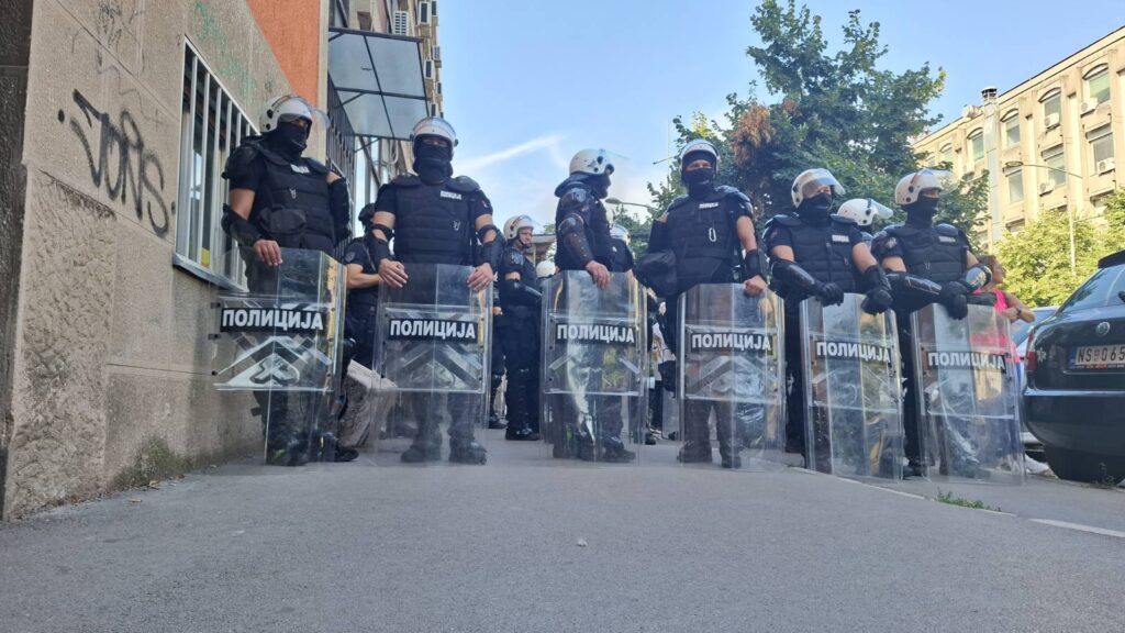 Do manjeg guranja je došlo oko 8.30 časova kada je policija u opremi za razbijanje demonstracija odgurala okupljene ispred ulaza iz ulice Maksima Gorkog. Tu su formirali kordon i na taj ulaz su propustili zaposlene da dođu do kancelarija.