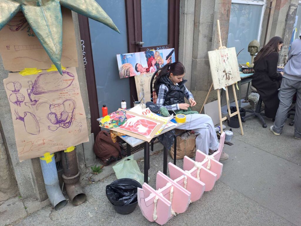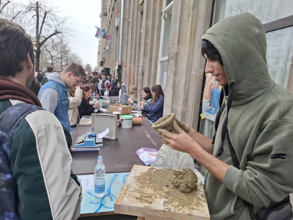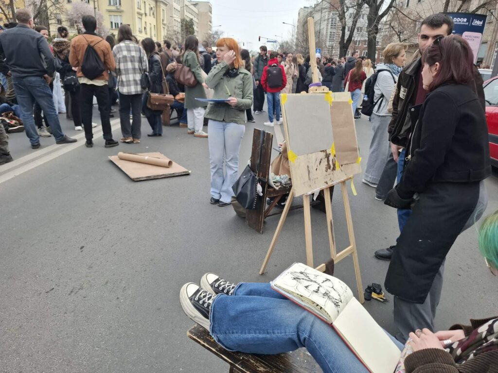 Studenti su se rasporedili po travnjaku i kolovozu. Sede na stolicama, klupama, ćebadima i rade ono što bi radili tokom časova – slikaju, crtaju, vajaju i izrađuju predmete od različitih materijala.