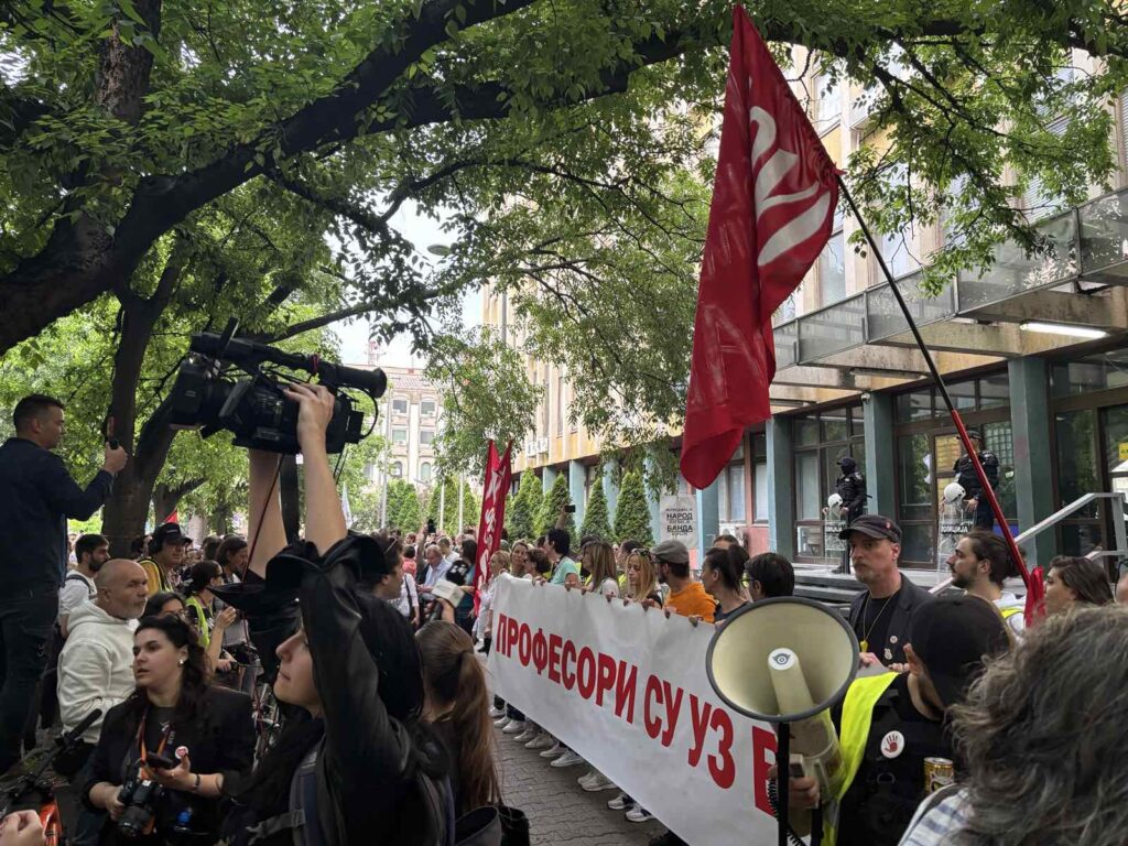 Ispred ulaza u sud istaknut je transparent sa natpisom „Profesori su uz vas“.