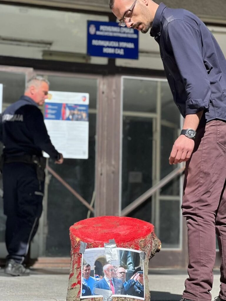 Brković je sa još nekoliko aktivista ispred institucija doneo drveni panj i debla sa tragovima crvene boje na kojima je bila zakačena fotografija Radonjića, Galića i Đurića, a aktivisti su panjeve i debla ostavili ispred zgrade Policijske uprave u Novom Sadu, zgrade Pokrajinske vlade i Gradske kuće.