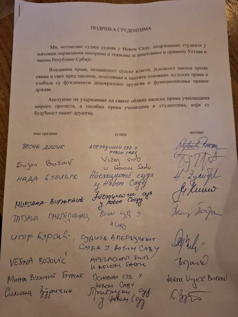 U tekstu na koji se stavlja potpis navodi se da sudije sudova u Novom Sadu podržavaju studente u njihovim opravdanim naporima i težnjama za poštovanje i primenu Ustava i zakona Republike Srbije.