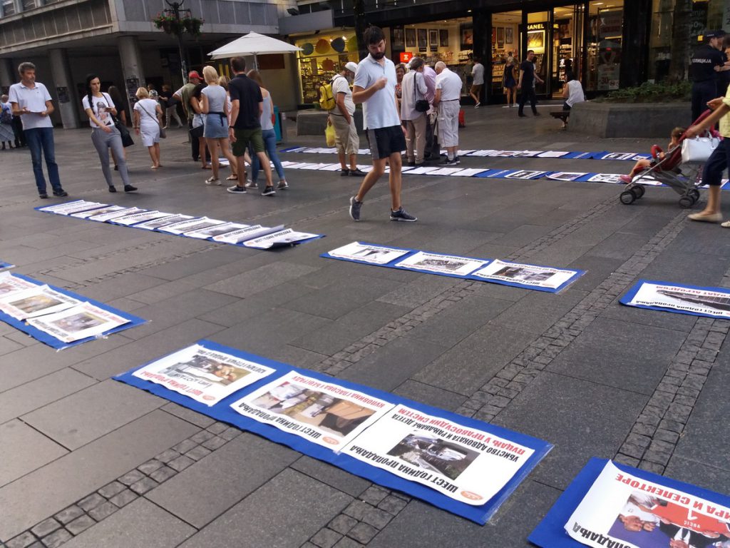 Ispred nekadašnjeg restorana Ruski car u Knez Mihailovoj ulici izloženi su plakati s fotografijama i opisima, koji prikazuju događaje koji su, po mišljenju predstavnika Pokreta za preokret, obeležili ovu i godine unazad do 27. jula 2012. godine.