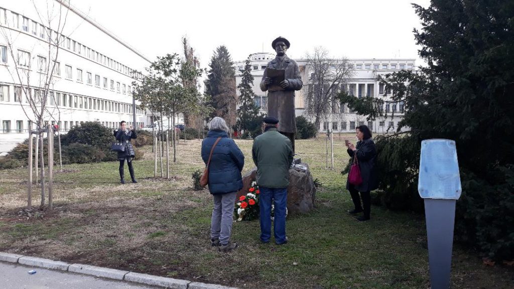 Učenici Osnovne škole „Vasa Stajić“ govorili su detalje iz biografije Vase Stajića kod spomenika koji se nalazi preko puta Skupštine grada Novog Sada i u blizini zgrada Skupštine i Vlade Vojvodine.