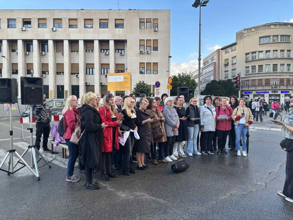 Obraćajući se okupljenima, psihološkinja Jasmina Mihnjak je istakla da mnoge žene rađaju decu u sistemu u kom deci u školama padaju plafoni na glavu.