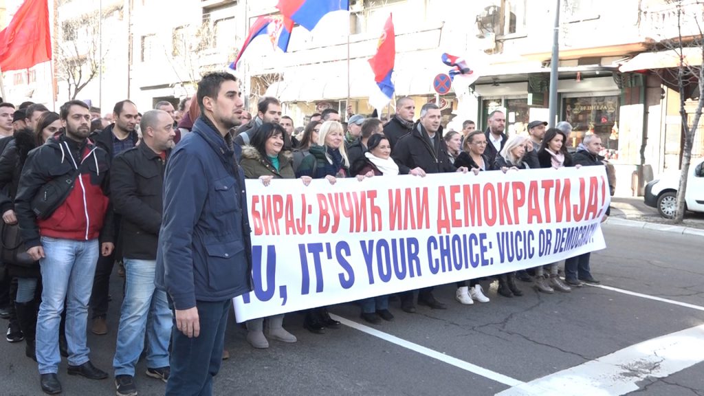 Okupljeni nose transparent na kojem piše „EU biraj: Vučić ili demokratija“, a poruka je napisana i na engleskom i na srpskom jeziku.