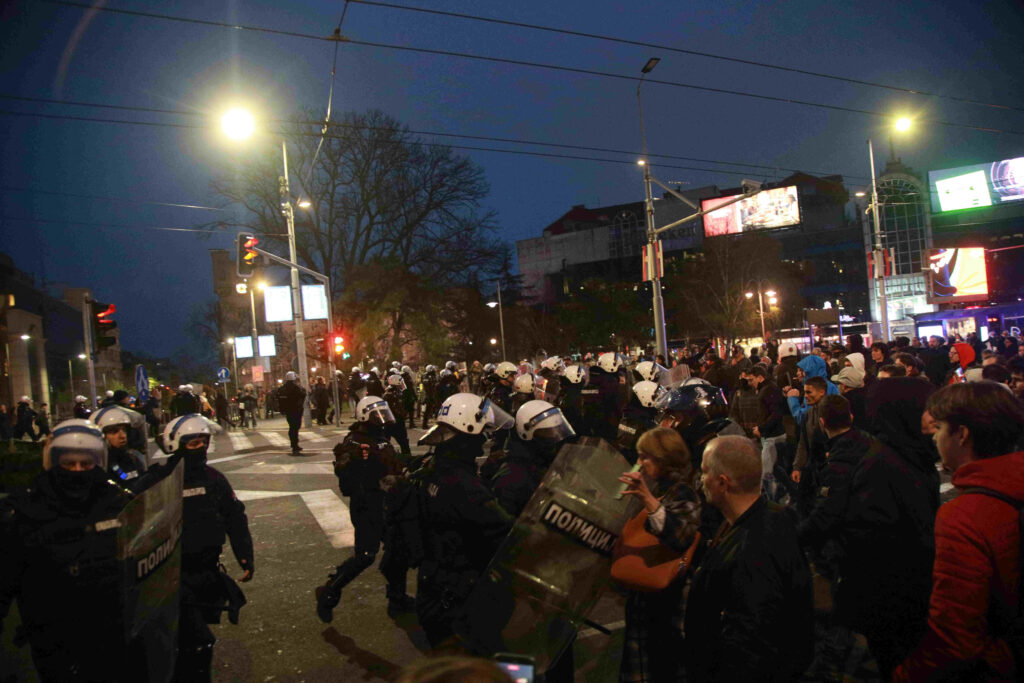 19.27 Policijski kordon formiran je na raskrsnici kod Narodnog muzeja, a nakon pokušaja rasterivanja građana koji su opkolili policiju, jedan momak je priveden.
