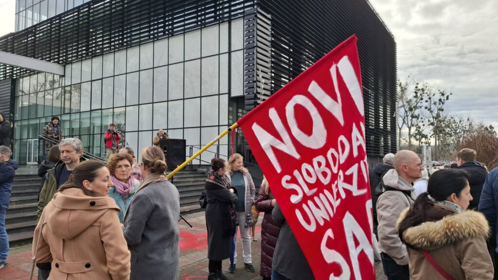 Članovi akademske mreže Slobodan univerzitet organizovali su jutros protest ispred zgrade Rektorata Univerziteta u Novom Sadu, tokom trajanja sednice Senata.
