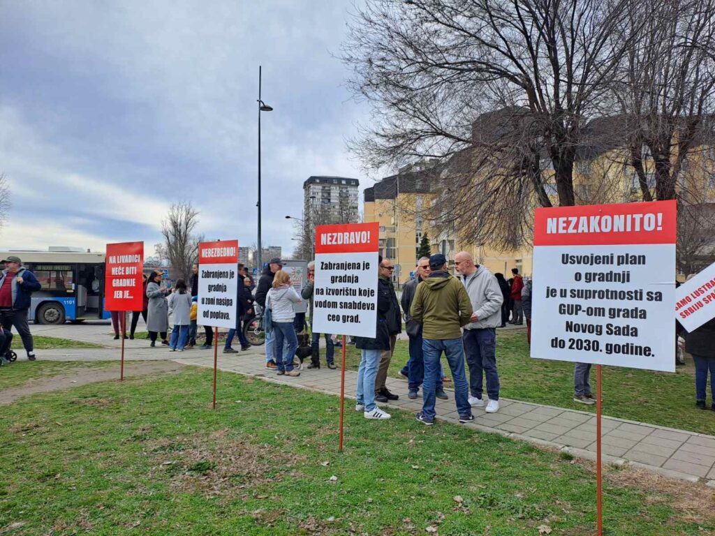 Građani su postavili transparente “Na livadici neće biti gradnje”, “Nebezbedno! Zabranjena je gradnja u zoni nasipa od popolava”, “Nezdravo! Zabranjena je gradnja na izvorištu koje vodom snabdeva celi grad”, “Korist od gradnje imaće isključivo investitor i pojedinci koji dozvoljavaju ovu gradnju”, “Urbicid, ekocid, korupcija”, “Zdrava voda nema cenu”, “Pamtiće vas Novi Sad po vašim delima”, “Novi Sad vam neće oprostiti”.