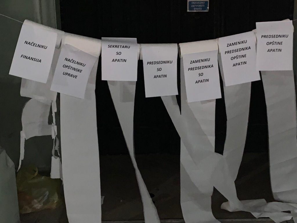 Građani su ispred zgrade Skupštine opštine okačili 29 toalet papira, koliko ima i odbornika, a najveći toalet papir namenili su čelnicima opštine.