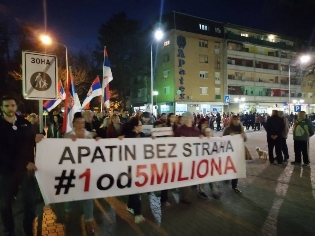 Osmi protest „1 od 5miliona“ održan je večeras u Apaptinu u organizaciji UG „Bez straha“, sa kojeg je poručeno da je vlast u sve većoj panici zbog činjenice da je nezadovoljni narod „rešio da ide do kraja“, odnosno „dok ne vidi leđa Aleksandru Vučiću i njegovom režimu“.