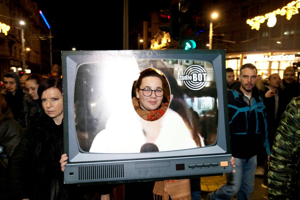 Sve vreme je sa razglasa puštana špica „Dnevnika“, čule su se sirene koje zavijaju, a građani su skandirali „Vučiću, lopove“.