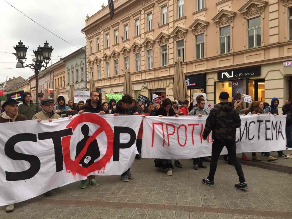 Na čelu kolone građani nose velike transparente “Protiv sistema”, “Stop Vučiću” i Sačuvajmo Knesku četvrt”. Jedan od velikih transparenata nose penzioneri, a na čelu kolone su i dobošari.