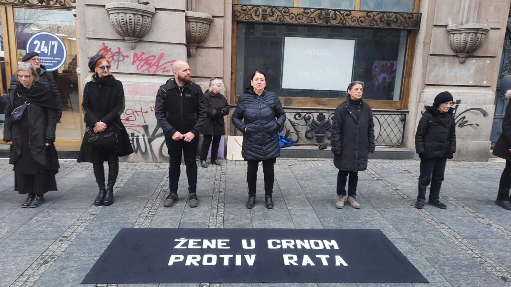 Nevladina organizacija Žene u crnom organizovala je danas u Knez Mihailovoj ulici antiratni protest u crnini i ćutanju povodom četvrte godišnjice rata u Ukrajini sa porukom „Stop ratu u Ukrajini, Putina u Hag“.
