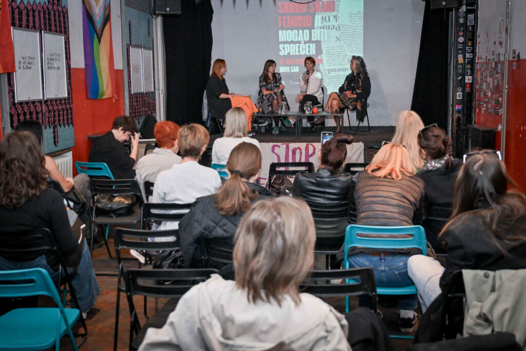 Okupljeni na tribini, nakon protestnog performansa, predočili su trenutnu situaciju u zemlji – bila je to zapravo, na žalost, dobro znana slika neefikasnog, vrlo bledog i neadekvatnog, dakle u pravom smislu gotovo nepostojećeg angažmana institucija u ovoj zemlji u sprečavanju nasilja nad ženama. U razgovoru su učestvovale: novinarka Tamara Srijemac, Adrijana Čović iz Udruženja FemPlatz i aktivistkinja Grupe Žene za promene Maja Vasić.
