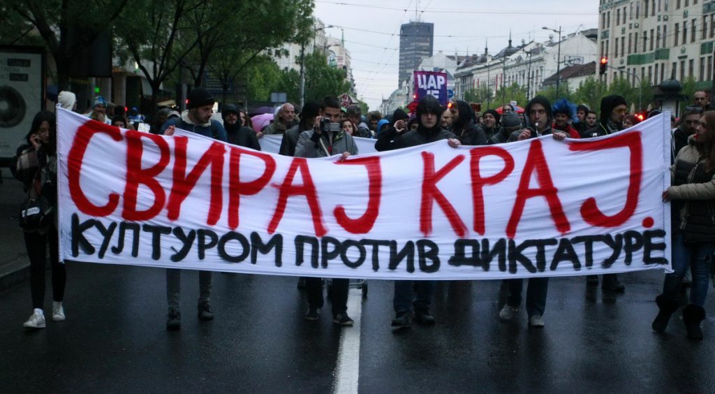 Građani u koloni na čijem čelu su bili dobošari, duvali su u pištaljke i uzvikivali „Hoćemo kulturu, a ne diktaturu!“, „Onesvesti se, onesvesti se!“, „Ko ne skače, taj je Vučić!“, i druge parole.