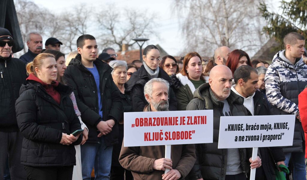 Građani su, između ostalih, nosili transpente sa porukama: „Knjige, braćo moja, knjige, a ne zvona i praporci“ i „Obrazovanje je zlatni ključ slobode“