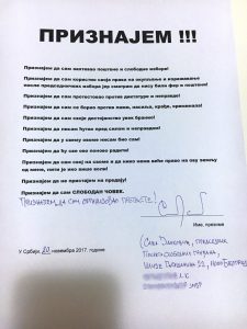 Lider Pokreta slobodnih građana Saša Janković danas je na pisarnici Ministarstva unutrašnjih poslova predao svoje, kao i „izjave priznanja“ više od 150 ljudi u kojima tvrde da su oni organizovali proteste „Protiv diktature“ koji su počeli 3. aprila, dan posle održavanja predsedničkih izbora u Srbiji.