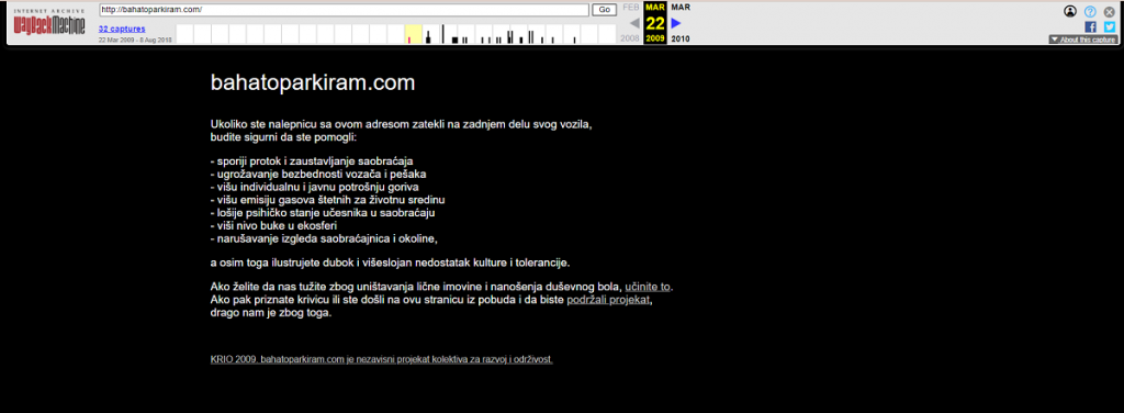 „Kampanja koju smo mi krenuli se zvala zapravo bahatoparkiram.com i imalo je takvo ime da bi se taj pojedinac osetio krivim. I lepili smo te nalepnice na zadnji deo vozila svakoga ko bi bio nepropisno parkiran na neki od različitih načina, a znamo da ih je mnogo. Tako da smo mi praktično samo napravili nalepnicu koja je govorila sve i tim sloganom bahatoparkiram.com. Sam sajt je sadržao neke osnovne informacije zašto to zapravo nije dobro, jer mnogo ljudi bi zapravo upalilo sva četiri svetla, negde stali da nešto završe, nesvesni koliko to ima negativnih posledica po grad i po sugrađane, pre svega“, navodi on.