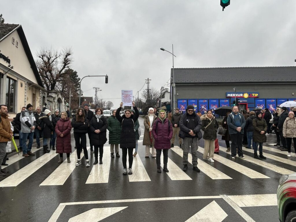 Učenici Gimnazije „Laza Kostić“, u kojoj je obustavljena nastava blokirali Bulevar Patrijarha Pavla ispred kružnog toka na Telepu. Petnaestominutna blokada je prošla bez incidenata.