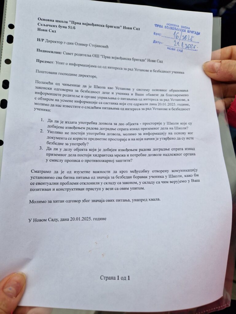 „Smatramo da je od izuzetne važnosti da kroz međusobnu otvorenu komunikaciju ustanovimo sva bitna pitanja od značaja za bezbedan boravak učenika u školi, kako bi se eventualni problemi otklonili u skladu sa zakonom“, navodi Savet roditelja OŠ „Prva vojvođanska brigada“ u dopisu direktoru ove škole.