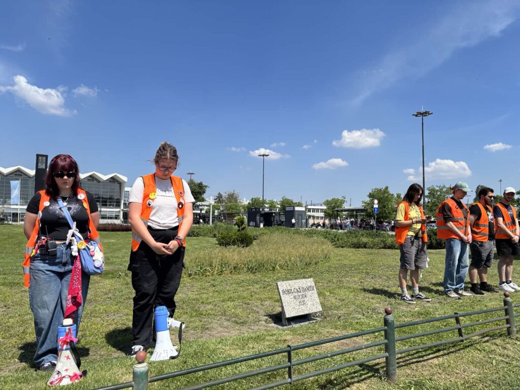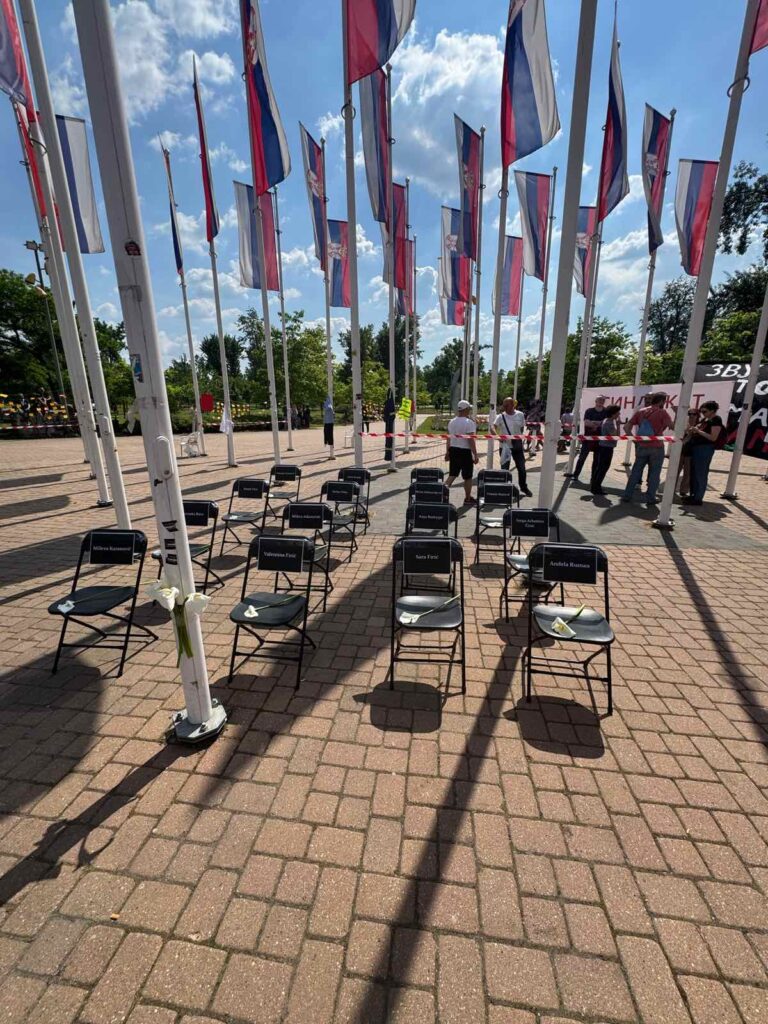 Stolice sa imenima poginulih i izložba radničke odeće u parku kod jarbola