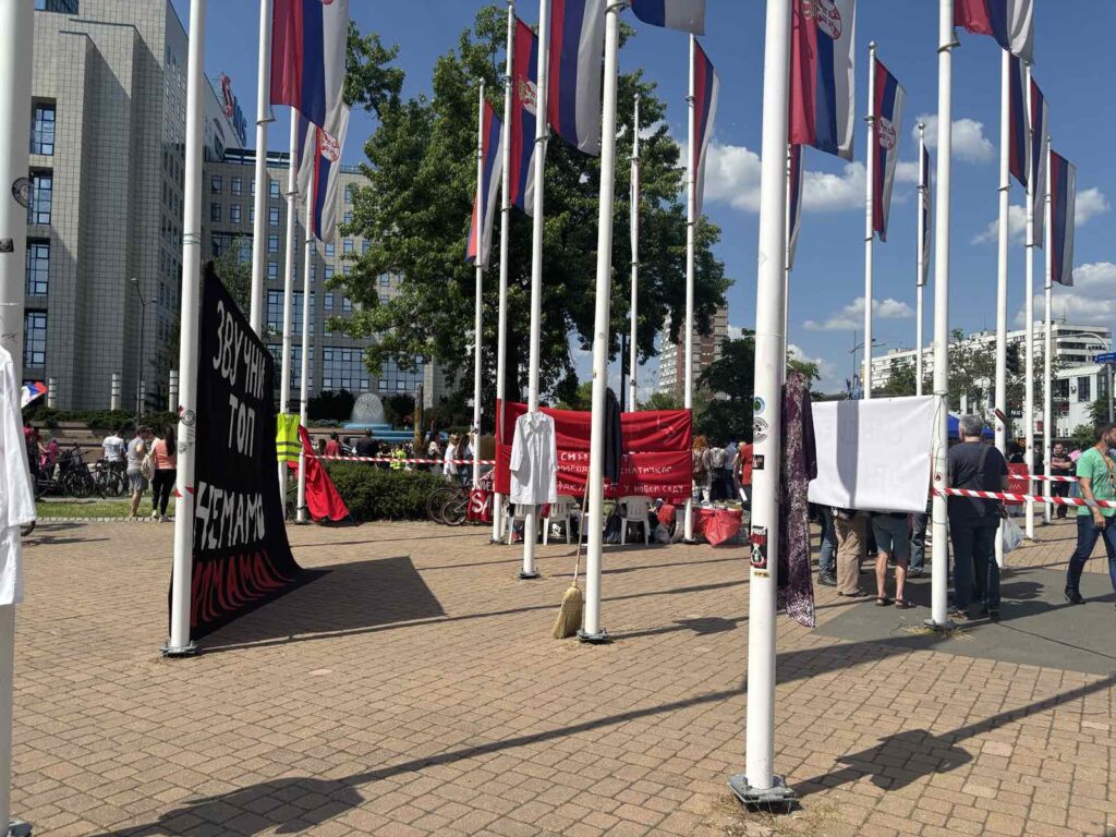 Okupljeni su nosili različite zastave, a među njima je bila i jedna, bele boje, na kojoj su u formi srca nacrtano 16 otisaka krvave šake (u spomen na 16 žrtava nadstrešnice) i jedan otisak krvave šapice (u spomen na psa Donu koju je usmrtilo vozilo Kliničkog centra Vojvodine na jednom od protesta).