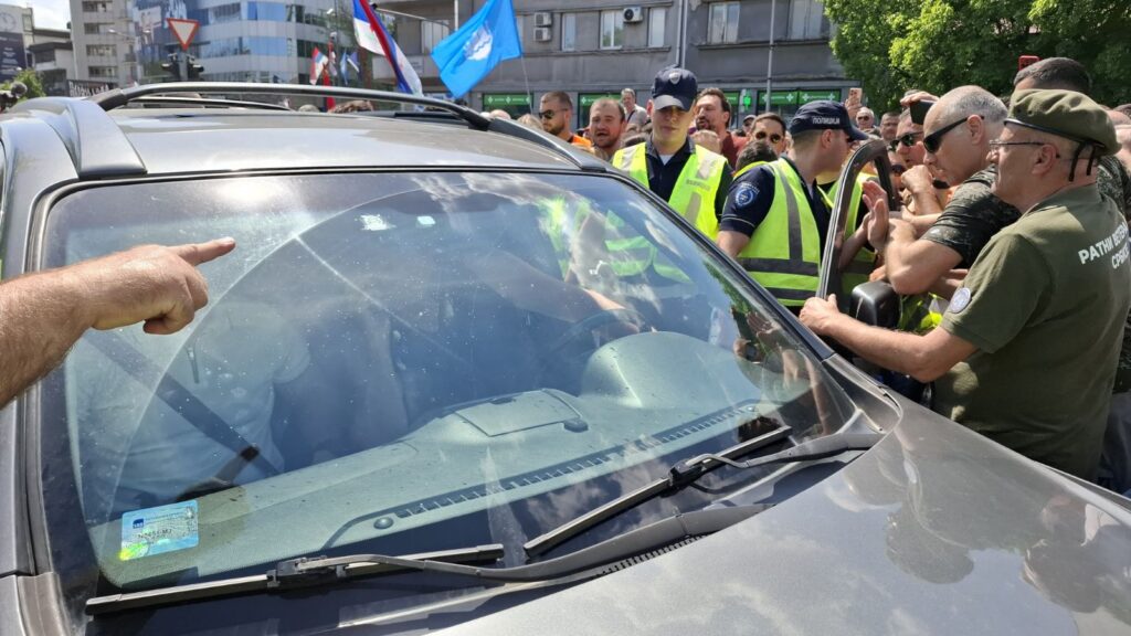 Kada je prišao koloni, građani su ih zaustavili i odmah opkolili zajedno sa redarima. Policija je legitimisala vozača i suvozača i privela ih.