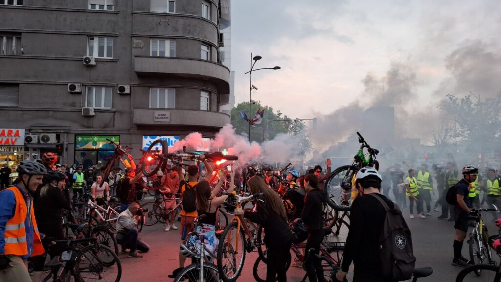 U Novi Sad, oko 19.15 prvo je stiglo više desetina biciklista koji su jutros krenuli iz Beograda, Oni su ispraćeni aplauzom i bakljama, uz tradicionalni biciklistički pozdrav podizanjem bicikala u vis.