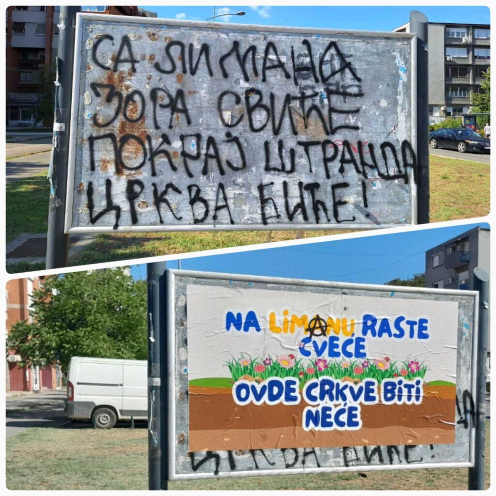 Na bilbordu je pisalo „Na Limanu raste cveće, ovde crkve biti neće„. Bilbord su građani prelepili preko grafita na kojem je pisalo „Sa Limana zora sviće pokraj Štranda crkva biće“.