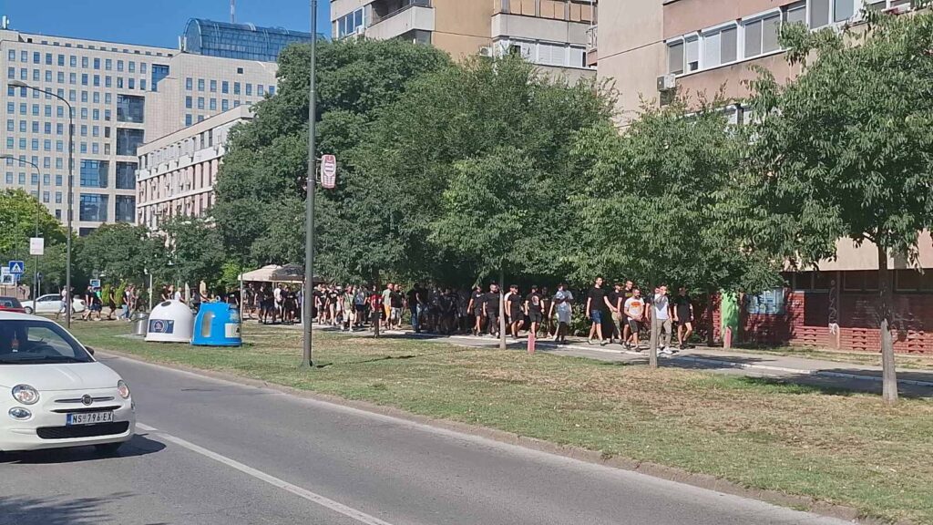 Više stotina mladića, koji podsećaju na pripadnike navijačkih grupa, okupilo se jutros kod zgrade Naftne industrije Srbije i Mosta slobode na Limanu.