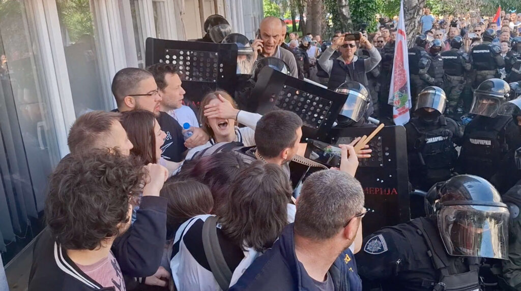 Potom je pokušao sa policijom da upadne na fakultet na stražnji ulaz, gde je došlo do guranja sa masom okupljenih studenata i građana.