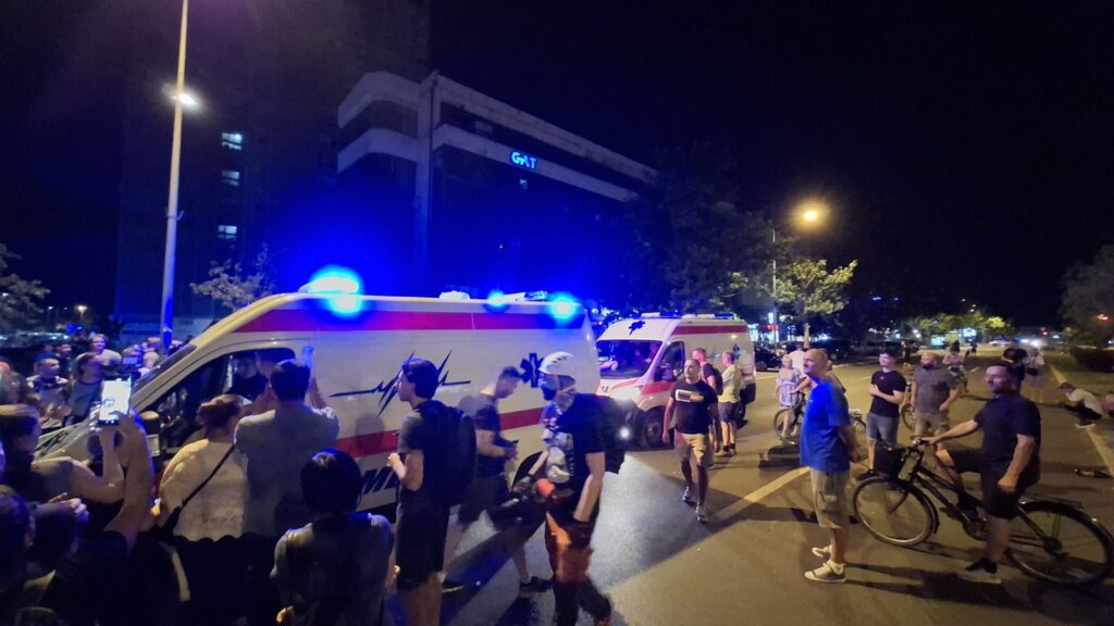 Studenti u blokadi Medicinskog fakulteta u Novom Sadu pitaju direktora Zavoda za hitnu medicinu Bogdana Živanovića „Ko je poslao i isporučio drvene palice pomoću vozila Hitne pomoći“, na protestu u Novom Sadu 14. avgusta.