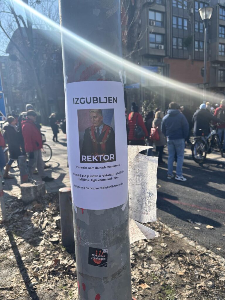 „Naši profesori trpe ogromne pritiske samo zbog toga što ne žele, kao ni mi, da na čelu našeg univerziteta bude čovek za kog se vezuju mnogobrojne afere i koji stoji iza sramnog saopštenja Rektorata i Dekanskog kolegijuma u kome su studentske blokade upoređene sa političkim zahtevima i u kome je rečeno da njima nije mesto na fakultetima“, navode studenti.