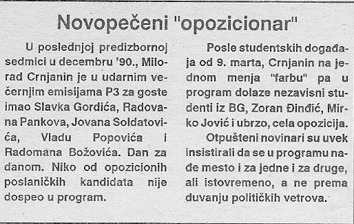 Odjednom se u programu pojavljuju beogradski studenti, Zoran Đinđić, Mirko Jović iz SNO i tako redom, cela opozicija. Novinari koji su se svim silama zalagali da se uvek čuju i jedn a i druga strana, sada se kao važni svedoci eliminišu iz programa, a urednik Crnjanin najglasniji opozicionar u redakciji. To je opet pogrešno zato što novinar mora da bude nepristrasan.