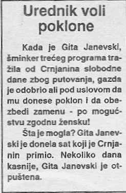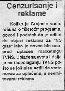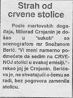 mc0003U međuvremenu, dogodila se i jedna (najzad!) prijatna stvar. Poučen devetomartovskim iskustvima, Crnjanin je u „svom“ programu našao prostor i za probleme studenata, pa je za studenstsku emisiju odvojio pola sata nedeljno. Bez obzira na povod za ovakvo dobročinstvo, jedno je sigurno: ovom emisijom i verovatno još ponečim što će im udesiti šef svih Crnjanina, Radomir dr Božović, studenti su jeftino kupljeni, a pravo da uređuju emisiju dobili su oni koji su se ogradili od zahteva da budu smenjeni čelnici TVNS i da Božović podnese ostavku.