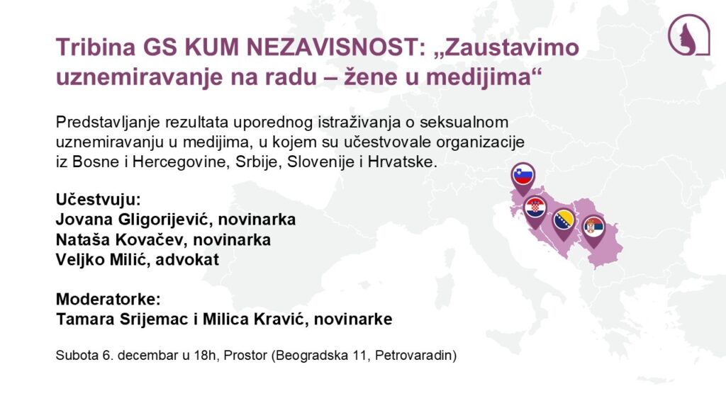U okviru tribine biće analizirani rezultati regionalnog uporednog istraživanja o seksualnom uznemiravanju na radnom mestu u medijima, prvog takve vrste u regionu, u kojem su učestvovale organizacije iz Slovenije, Hrvatske, Bosne i Hercegovine i Srbije.